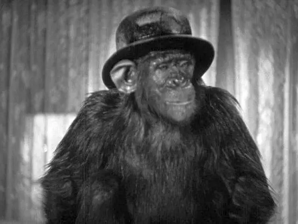 Aap Oliver (met bolhoed en snorretje) zegt lipsynchroon met Olivers stem: ‘I have nothing to say!’