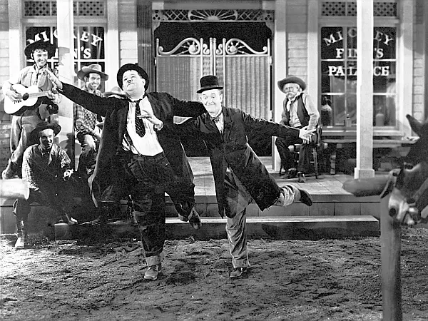 In “Way Out West” reizen de oosterlingen Laurel en Hardy per muilezel naar de oude westelijke stad Brushwood Gulch. Hun missie is om een eigendomsakte van een goudmijn te overhandigen aan ene Mary Roberts, zoals haar nagelaten door haar overleden vader.
